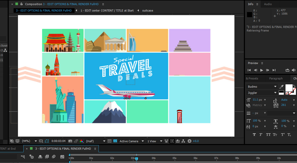 After Effects Travel Promo project: http://tinyurl.com/Travel-Promo-AE A short & modern flat designed, Travel Promo to use as an Intro or Outro to your advert or Youtube channel! Upload to your social media and promote your worldwide travel services (air tickets travel agents, international cruises, hotels booking, car rentals, cityscape tours, city maps apps etc) Features touristic attractions & monuments from many famous international destinatios! Germany – Berlin Brandenburg Gate Turkey – Istanbul Blue Mosque Japan – Fujiyama mountain & traditional Gate USA – New York Liberty Statue Mexico Teotihuacan Pyramid France – Paris Eiffel Tower Holland (The Netherlands) Dubai Skyscrapers & Hotels Brazil – Rio De Janeiro Christ the Redeemer Greece – Athens Acropils Parthenon India – Taj Mahal Thailand – Buddha Statue China – Shanghai & traditional Temple Russia – Moscow Red Square St. Basil Egypt – Pyramids UK – London Eye & Big Ben Indonesia – Bali Italy – Pisa & Colloseum Australia – Sydney (optional for center square) You can select between 20 travel symbols (in the centered square) to match with your services, or just type your slogan! Reveal your logo or image / video at the end! Easy background colors change to match your brand or logo! Project resolution versions in: • Ultra HD 4K 3840×2160 & FullHD 1080 Software needed to open & customize video: After Effects CS5 and all newer CC versions. No plug-ins required (You can even render with the trial version of After Effects!) Download AE project: http://tinyurl.com/Travel-Promo-AE